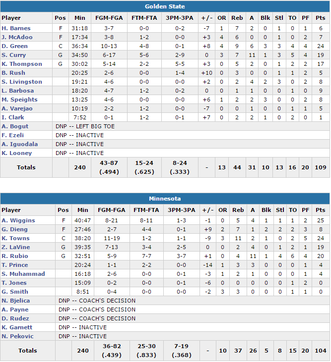 Sans Andrew Bogut, Andre Iguodala et Festus Ezeli, les Warriors évitent de perdre pour la première fois de la saison deux rencontres de rang. En premier quart ils ont été aidés par les 7 ballons perdus des Wolves pour démarrer par un 10-4 mais les locaux se sont accrochés et sont même repassés devant grâce à 61% aux shoots. Les deux équipes se sont rendues coup pour coup et Minnesota a même compté une avance de 6 points dans le second mais les visiteurs ont terminé sur un 8-3 grâce à Green et Curry. Dans le 3ème les loups ont continué de jouer crânement leur chance et sur un 10-0 ils ont pris l’avantage 89-81. Mais les Warriors ont de la ressource et ont répliqué par un 8-0 et les 2 équipes étaient à égalité à l’entame des 12 dernières minutes.