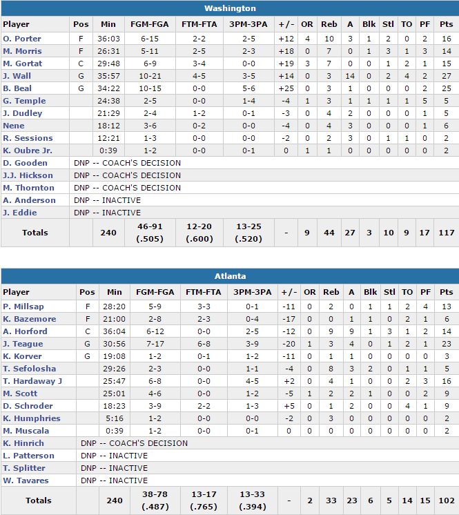 John Wall a une nouvelle fois sorti un gros match avec 27 points à 10/21 et 14 passes, mais il a aussi été aidé par Bradley Beal (25 points à 10/15 dont 5/6 derrière l’arc), Otto Porter (16 points et 10 rebonds), Marcin Gortat (15 points et 7 rebonds) et Markieff Morris (14 et 7 rebonds). Washington a réalisé une superbe prestation offensive avec 50.5% aux tirs dont un 13/25 derrière l’arc et seulement 9 ballons perdus. Les Hawks n’ont pas eu autant d’adresse à l’extérieur avec un 9/33 et ils ont en plus capté seulement 2 rebonds offensifs contre 9 aux Wizards en plus de 14 ballons perdus.