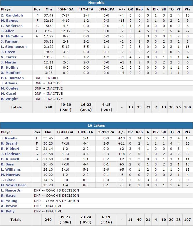 Côté Grizzlies, qui restaient sur 2 victoires consécutives, Tony Allen signe 27 points à 12/12 et Zach Randolph et Lance Stephenson ajoutent chacun 16 points. Les deux équipes perdent chacune 20 ballons et shootent à au moins 50%