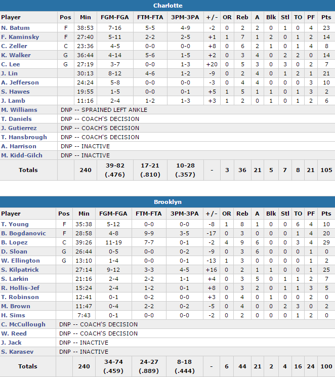 Brooklyn a très mal démarré le match en scorant seulement 14 points dans le premier acte pour permettre à Charlotte de faire la course en tête quasiment de bout en bout. A la pause Charlotte comptait 10 points de retard et pensait avoir fait le plus dur en démarrant fort la seconde mi-temps avec notamment un 8-0 qui a porté l’avance à 17 unités. La suite du quart est totalement à l’avantage des locaux qui sont revenus à 64-64 grâce à Lopez, Kilpatrick et Larkin. Ils sont même passés brièvement devant avant que le duo Lamb et Lin ne donne de l’air aux Hornets, qui ont ensuite géré tant bien que mal cette avance, grâce à un super Nico Batum.