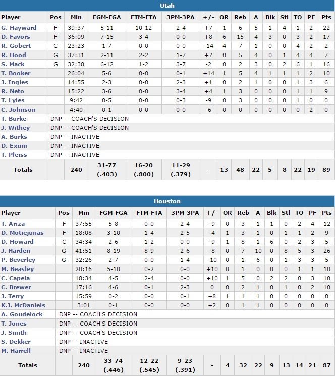 Gordon Hayward a fait le job avec 22 points à 5/11 alors que Favors signe 17 points et 15 rebonds et Shelvin Mack ajoute 16 points. Le Jazz a compté jusqu’à 18 points de retard en première mi-temps, en grande difficulté offensivement. Utah shoote à seulement 40.3%, contre 44.6 aux Rockets et perdent 22 ballons, mais ils rentrent 11 trois points et dominent au rebond avec 9 prises offensives de plus. James Harden compile 26 points à 8/19, 10 rebonds, 8 interceptions et 5 passes mais il a été bien seul. Dwight Howard marque 5 points à 2/6 en plus de 8 rebonds et 6 contres dont un dunk pour égaliser à 22.3 secondes du buzzer. Harden a manqué le shoot de la gagne au buzzer.