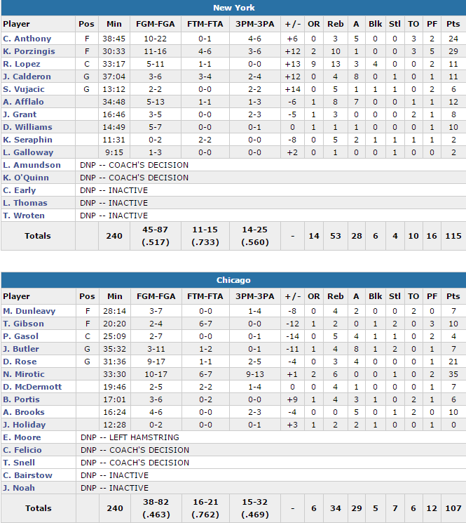 Porzingis a montré son potentiel en alternant jeu intérieur et extérieur avec un 3/6 derrière l’arc. Le duo a été aidé par 4 autres joueurs entre 10 et 12 points dont 12 pour Arron Afflalo en sortie de banc. NY shoote à 51.7% dont un énorme 14/25 à trois points tout en perdant seulement 10 ballons, face à une défense des Bulls pas à la hauteur. Jimmy Butler a été en grande difficulté avec 7 points à 3/11 et 8 passes et Pau Gasol a lui aussi une soirée compliquée avec 4 points à 2/7. Nikola Mirotic s’est démené en battant son record de carrière avec 35 points dont un 9/13 derrière l’arc, un record de franchise égalé pour le nombre de trois points sur un match. Derrick Rose ajoute 21 points à 9/17.