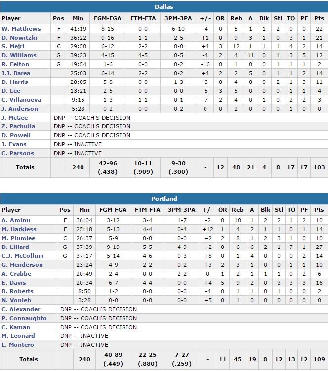 Dallas, porté par les 22 points de Wesley Matthews et un nouveau bon match de Salah Mejri (titulaire pour la 4ème fois de la saison) avec 14 points et 12 rebonds mais aussi 21 points de Dirk Nowitzki, est désormais à égalité avec Utah à la 7ème place de la Conférence et perd un 8ème match en 10 rencontres. Maurice Harkless, auteur de 14 points, 4 rebonds, 2 passes, une interception et un contre en 25 minutes, a apporté un vrai boost à Portland, en plus des 16 points à 6/7 d’Ed Davis en sortie de banc (tous en première mi-temps), des 14 points de C.J. McCollum et Mason Plumlee, tandis qu’Aminu et Henderson terminent tous deux à 10 points (plus de 10 rebonds pour Aminu).