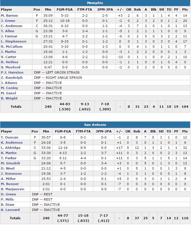 Aldridge plante 17 points dans le premier quart-temps, un record pour n’importe quel joueur dans un quart-temps pour San Antonio cette saison. Les Spurs sont déjà à 37 points à la fin du premier quart-temps (record en saison) et shootent à 63% sur toute la première mi-temps. Zach Randolph, seul survivant du trio depuis les blessures de Marc Gasol et Mike Conley, n’a pas joué en raison d’une entorse à la cheville droite.