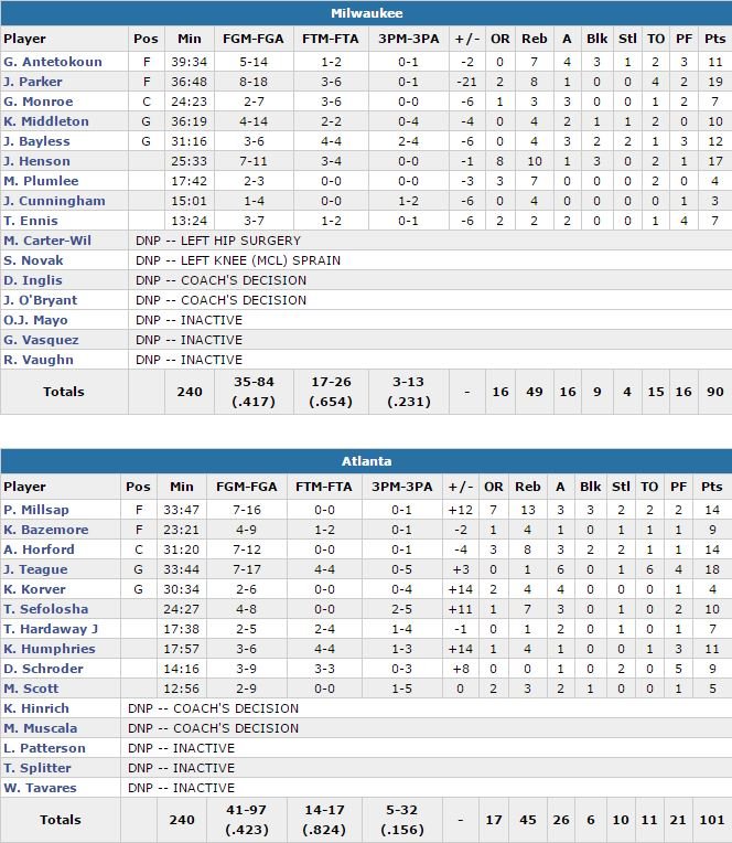 Jabari Parker termine meilleur marqueur de Milwaukee (qui avait gagné les deux première confrontations de la saison en prolongations) avec 19 points, accompagné d’Henson et de ses 17 points et 10 rebonds. Les Bucks (dominés 58 points à 42 dans la peinture alors qu’ils sont premiers de la ligue dans ce domaine) n’ont fait que 16 passes et ont perdu 15 ballons. Devant 51-46 à la mi-temps, Atlanta a laissé ses adversaires revenus à un point avant de passer un 10-2 pour reprendre une avance confortable 75-66.