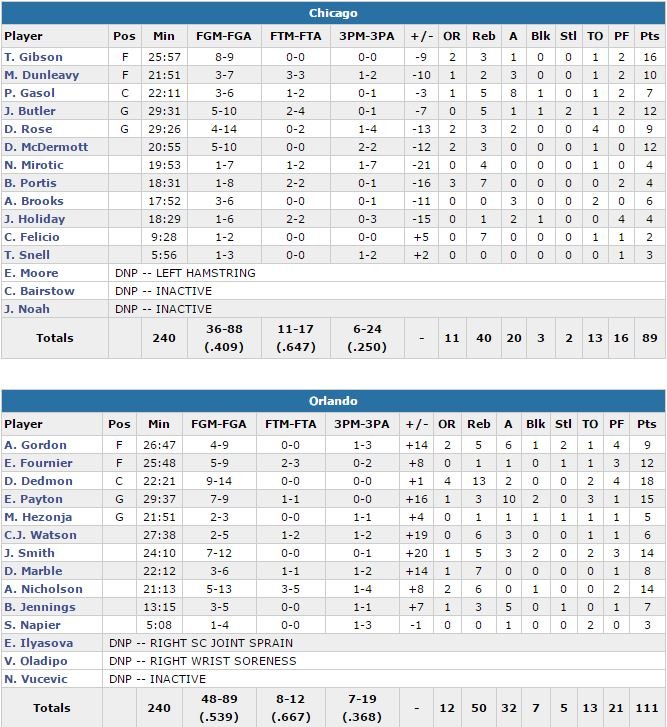 Derrick Rose ne signe que 9 points à 4/14, Jimmy Butler 12 points à 5/10 et Pau Gasol, limité à 22 minutes, 7 points à 3/6, 5 rebonds et 8 passes. Seul Taj Gibson s’en est sorti dans la peinture avec 16 points à 8/9 et 3 rebonds en 25 minutes de jeu. Excepté un bref run dans le troisième quart-temps pour passer de 18 à 9 points de retard, les Bulls n’ont jamais fait preuve d’un véritable sentiment d’urgence. Rapidement servi par ses coéquipiers en l’absence de Victor Oladipo et Nikola Vucevic, Dedmon compte déjà 16 points à la pause et alors que le Magic est devant 68-50.