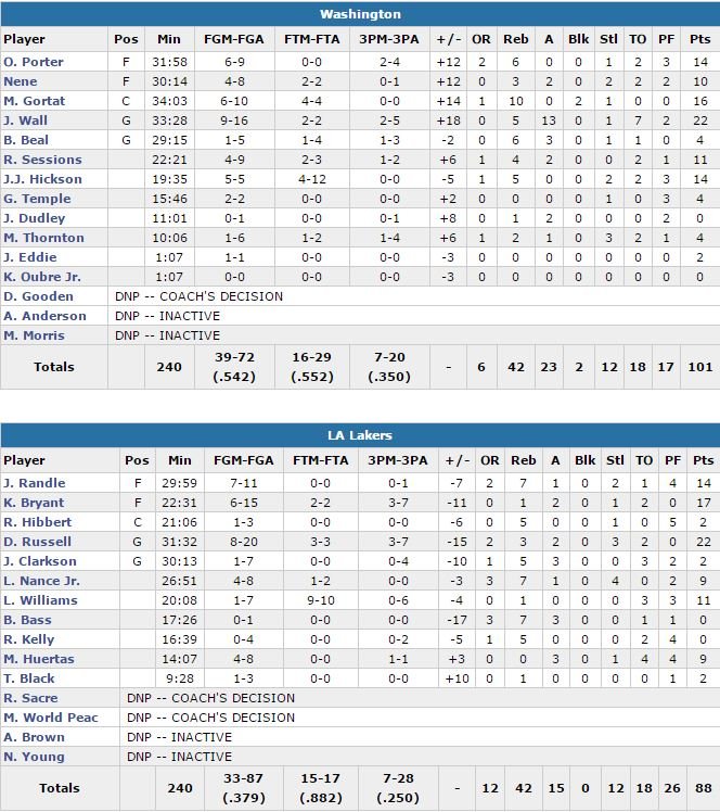 7ème défaite en 8 matchs pour les Lakers qui, malgré 17 points en 23 minutes de Kobe Bryant, tombent pour la 58ème fois de la saison. Vexés par leur défaite en double prolongation la veille contre Minnesota, les Wizards, qui veulent toujours croire aux playoffs, s’imposent 101-88.