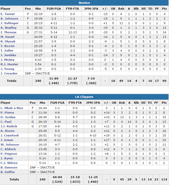 DeAndre Jordan a compilé 15 points et 13 rebonds alors que Chris Paul ajoute 13 points à 5/14 et 14 passes en seulement 26 minutes. Le banc a également fait le job avec 16 points d’Austin Rivers, 15 de Jamal Crawford, 10 de Jeff Green et 11 de Wesley Johnson. Les Clippers ont mis à mal la défense de Boston en shootant à 52.4% dont un 11/25 derrière l’arc, ce qui leur a permis de compter jusqu’à 25 points d’avance alors que leur adversaire du jour rentre seulement 34.8% de ses tirs. Seuls trois joueurs atteignent les 10 points avec 24 points à 5/14 pour Isaiah Thomas et 13 unités pour Marcus Smart et Avery Bradley.