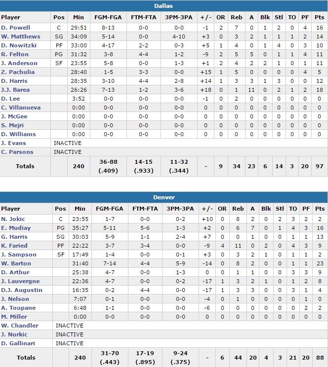 Denver perd 21 ballons, contre seulement 3 pour Dallas. Kenneth Faried était de retour après 4 matchs d’absence (dos) et signe 9 points et 11 rebonds. Barton a ramené son équipe à 72-66 sur un shoot au buzzer à 10 m pour oublier un 8-0 encaissé quelques minutes plus tôt après 2 ballons perdus. Son équipe devant 89-81, Barea scelle la victoire avec un 3-points dans le corner à 3’18.