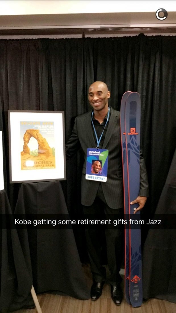 Pour son dernier match à Salt Lake City hier, Kobe Bryant a reçu deux cadeaux originaux de la part de la franchise. Il a posé avec après le match :