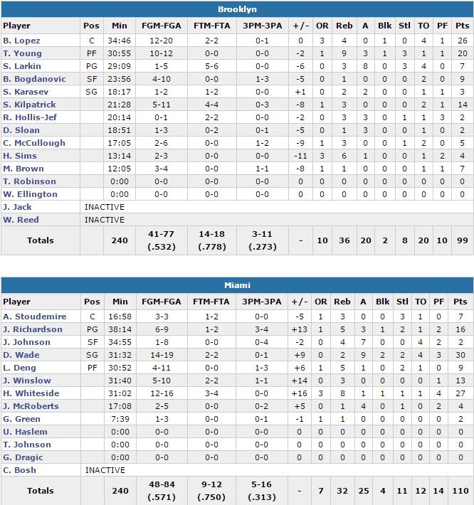 Josh Richardson ajoute 16 points et Justise Winslow 13 pour Miami, qui a fait verrouillé sa défense en seconde mi-temps. Joe Johnson n’a pas fait un grand match pour ses retrouvailles avec son ancienne équipe (2 points à 1/8, 4 rebonds et 7 passes) mais ses coéquipiers se sont assurés qu’il reparte avec la victoire. Les Nets sont menés par les 26 points de Brook Lopez et voient leur série de 7 matchs consécutifs à 100 points ou plus – la plus longue en 2 ans – s’arrêter là. Thaddeus Young a rentré ses 10 premiers shoots et signe 20 points pour les Nets.