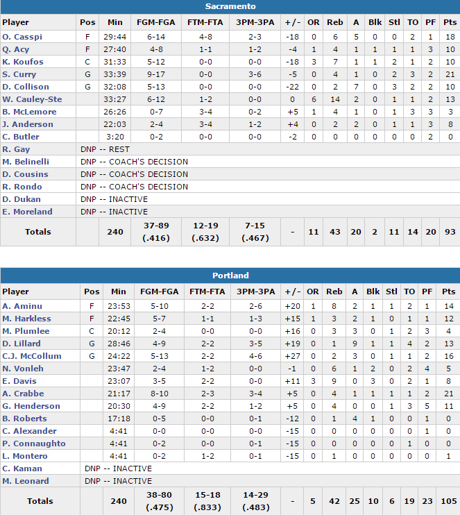 Le remplaçant Allen Crabbe a mené la danse avec 21 points alors que CJ McCollum en ajoute 16 et Damian Lillard en ajoute 16 avant d’aller s’asseoir sur le banc en dernier quart alors que l’avance des locaux a culminé à 28 points. Portland a shooté à 47.5% dont un joli 14/29 derrière l’arc alors qu’en face les Kings ont eu plus de soucis en attaque, limités à 41.6%, malgré le meilleur match en carrière de Seth Curry avec 21 points, tandis qu’Omri Casspi signe 18 points. Rudy Gay, Rajon Rondo et DeMarcus Cousins étaient eux au repos.