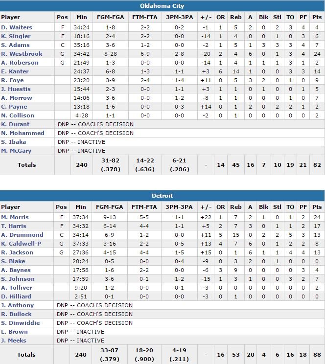 Les absences de Kevin Durant et Serge Ibaka pour repos hier n’ont pas pardonné au Thunder face à des Pistons (40-35) qui ont faim de playoffs. Marcus Morris et ses 24 points (9/13 et 7 rebonds) ont emmené Detroit vers une victoire 88-82 la nuit dernière.