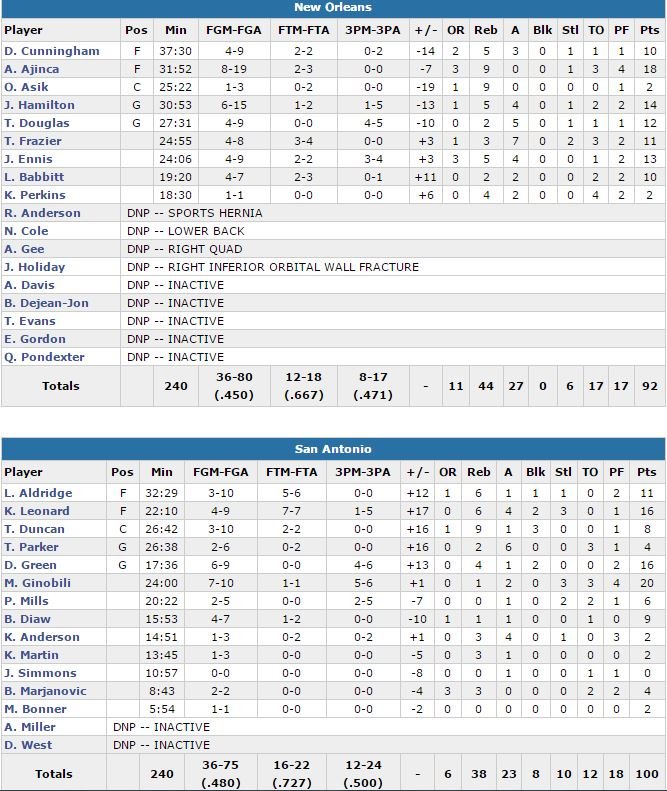 38ème victoire consécutive à domicile et record NBA pour les Spurs qui ont joué au complet ou presque (David West et Andre Miller n’ont pas joué) cette nuit et qui l’emportent 100-92 face aux Pelicans d’Alexis Ajinça (18 points à 9/19 et 9 rebonds). Manu Ginobili termine meilleur marqueur avec 20 points (7/10) alors que Kawhi Leonard signe 16 points (4/9, 6 rebonds, 4 passes et 2 contres) pour son retour après 3 matchs d’absence (contusion au quadriceps droit datant du 23 mars).