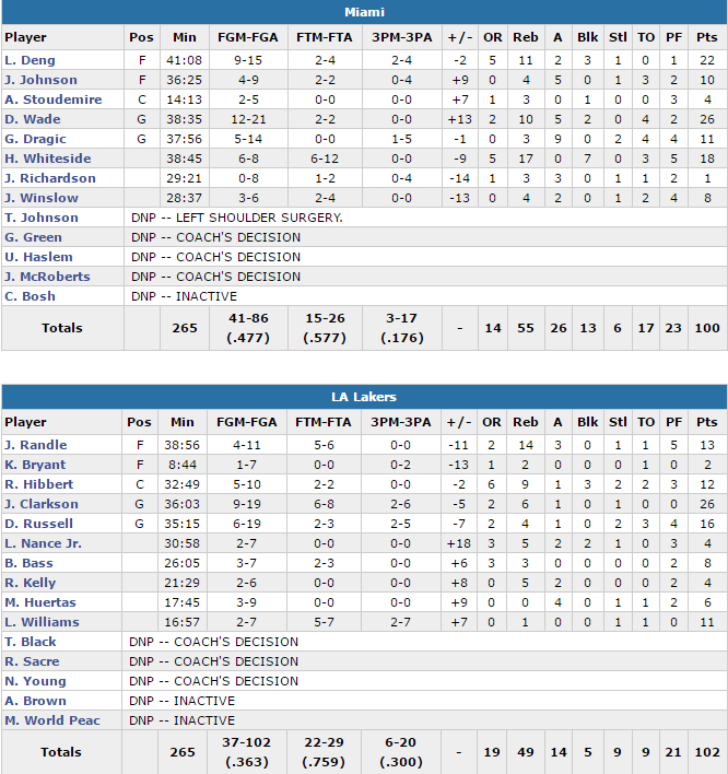 Les Lakers s’imposent malgré un pourcentage catastrophique de 36.3% aux tirs contre 47.7% aux Floridiens. Ils ont perdu seulement 9 ballons et rentré 22 de leurs 29 lancers alors que leurs adversaires shootent à 57.7% sur la ligne et à 3/17 derrière l’arc en plus de concéder 19 rebonds offensifs. Les Lakers ont été menés par leurs jeunes pousses Jordan Clarkson (26 points à 9/19), D’Angelo Russell (16 points à 6/19) et Julius Randle (13 points à 4/11 et 14 rebonds) alors que Kobe Bryant shoote à seulement 1/7. Les trois ont inscrit tous les points de leur équipe en prolongation et c’est Randle qui a marqué le panier de la gagne sur un hook à 1.9 seconde de la fin en prolongation. Le Heat restait sur 4 succès en 5 rencontres mais Joe Johnson a totalement manqué sa tentative au buzzer. Dwyane Wade est l’homme de la rencontre pour les Floridiens avec 26 points à 12/21, 10 rebonds et 5 passes, bien aidé par Luol Deng (22 points à 9/15 et 11 rebonds) et Hassan Whiteside (18 points à 6/8, 17 rebonds et 7 contres).