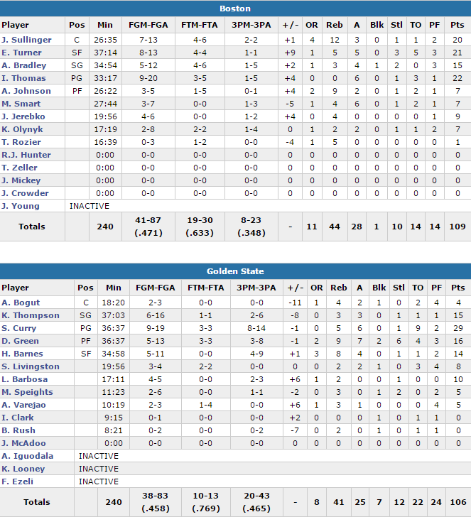Le 5 majeur des Celtics a fait un gros boulot avec le quatuor Isaiah Thomas (22 points, tous en seconde mi-temps à 9/20 et 6 passes), Evan Turner (21 points à 8/13), Jared Sullinger (20 points à 7/13 et 12 passes) et Avery Bradley (15 points à 5/12). Les Celtics shootent à 47.1% mais ils limitent surtout les Warriors à 45.8% malgré un énorme 20/43 derrière l’arc. Stephen Curry signe 29 points mais il est finalement assez bien contenu avec 9/19 aux tirs dont 8/14 à trois points et avec pas moins de 9 ballons perdus. Il score 21 de ses 29 points dans le 3ème et rentre seulement 2 points en dernier acte. Les champions perdent pas moins de 22 ballons sur la rencontre, ce qui a coûté leur perte. Klay Thompson shoote lui à seulement 6/16 pour 15 points alors que Draymond Green compile 16 points à 5/13, 9 rebonds, 7 passes, 6 interceptions et 4 ballons perdus.