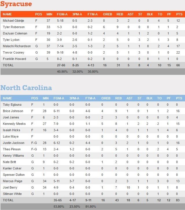 North Carolina a également largement dominé les débats face à Syracuse après une première mi-temps remportée 39-28. Joel Berry II a mené les Tar Heels avec 8 points, 10 passes et 7 rebonds avec une adresse d’équipe de 58.3%, dont 31/48 à deux points face à la zone. Tous les titulaires de North Carolina à l’exception de Berry II ont atteint les 10 points dont 16 pour Brice Johnson et Justin Jackson. Les Tar Heels ont construit leur succès sur leur domination intérieure, qui s’est aussi traduite au rebond avec un avantage 43-31. Syracuse a été mené par les 22 points de Trevor Cooney mais les hommes de Roy Williams ont bien géré leur avance de plus de 10 points acquise en première mi-temps et Marcus Paige a mis le coup de grâce à 2’55 de la fin avec un 3 points qui a mis l’écart à 13 unités.