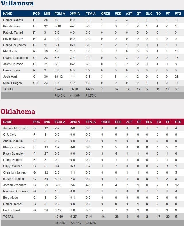 La première demi-finale entre Villanova et Oklahoma a tourné à la démonstration en faveur des Wildcats, qui atteignent la finale pour la première fois depuis 1985. Ils ont écrabouillé les Sooners après la pause pour un écart de 44 points, record dans l’histoire du Final Four. La star Buddy Hield a vécu un cauchemar avec 9 points à 4/12. Villanova a shooté à 71.4%, le second pourcentage de l’histoire du Final Four, le record leur appartenant lors de leur sel titre en 1985. A la pause tout était encore jouable avec un ne avance de 14 points pour Villanova mais le second acte a été remporté 53-23. Josh Hart a été intenable avec 23 points à 10/12 alors que Kris Jenkins en ajoute 18 à 4/7 à trois points et Ryan Arcidiacono 15 à 3/4 à trois points.