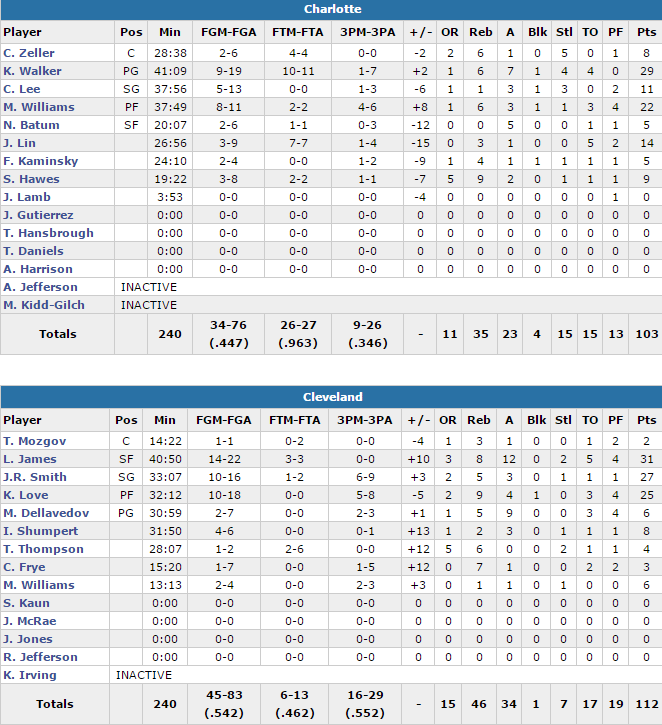 Malgré l’absence de Kyrie Irving, les Cavaliers ont livré une prestation solide dans le sillage du trio LeBron James (31 points à 14/22, 7 rebonds et 11 passes), Kevin Love ( 25 points à 10/18 dont 5/8 à trois points et 9 rebonds) et Jr Smith (27 points à 10/16 dont 6/9 à trois points) . Ils ont construit leur victoire sur une grosse adresse extérieure (16/29) et une bonne défense en début de rencontre pour s’envoler. Ils shootent à 54.2% et limitent dans le même temps les Hornets à 44.7% dont un 9/26 derrière l’arc. En face Kemba Walker et Marvin Williams ont été un peu seuls alors que Nicolas Batum est sorti à la pause, touché au genou.