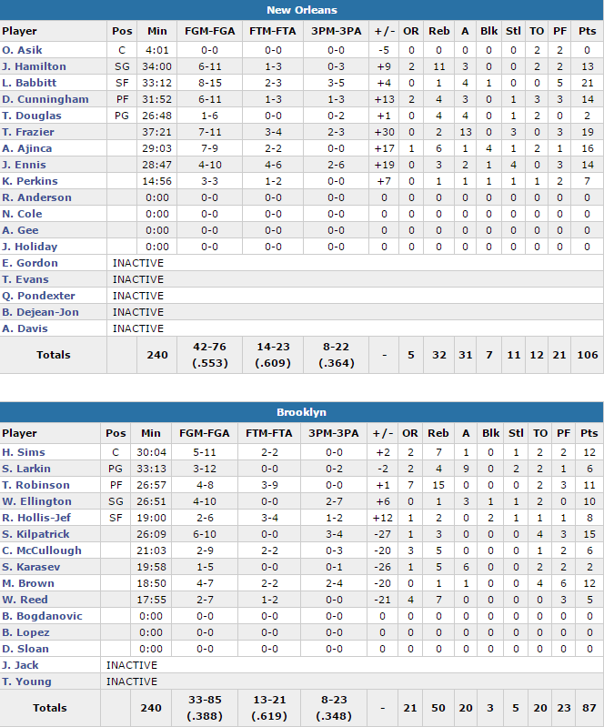 Luke Babbitt et Tim Frazier sont les hommes du match avec respectivement 21 points et 19 points, 13 passes. Alexis Ajinça n’est pas en reste avec 16 points à 7/9 et 6 rebonds alors que Dante Cunningham (14 points), James Ennis (14 points) et Jordan Hamilton (13 points et 11 rebonds) ont fait le job. Le job la défense des Nets ne l’a pas fait puisque New Orleans shoote à 55.3% contre 38.8% pour les locaux. Ces derniers, privés de Brook Lopez et Thaddeus Young, mis au repos jusqu’à la fin de saison n’ont trouvé personne pour les poster. Sean Kilpatrick signe 15 points et Thomas Robinson 11 points et 15 rebonds.