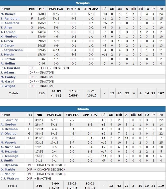 Pas de scoring régulier, une défense qui cède au pire des moments, Memphis (porté par les 24 points de Matt Barnes) a tout de même réussi à passer d’un déficit de 20 points à seulement 10 dans le 4ème quart-temps, mais les remplaçants du Magic Brandon Jennings et Andrew Nicholson ont combiné pour trois 3-points pour restaurer une avance confortable 109-91. Encore une fois, les Grizzlies vont revenir à 10 points, 109-99 à 3’18, mais leur tentative de comeback n’ira pas plus loin. Orlando (qui remporte un 3ème match consécutif à domicile et une 4ème rencontre en 5 matchs) est mené par les 25 points en sortie de banc de Nikola Vucevic. Victor Oladipo et Evan Fournier inscrivent chacun 22 points.