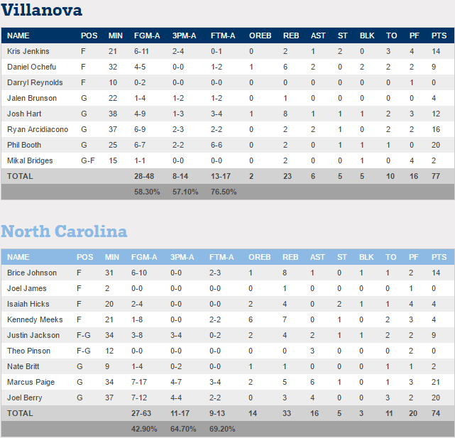 UNC a compté pourtant 10 points de retard à 4’43 de la fin alors que Villanova a viré derrière 35-39 à la pause. Une première mi-temps très disputée où aucune des deux équipes n’a pu faire de mini-break jusqu’à la dernière minute où les Tar Heels ont fait un run pour mener 39-32 avant un panier de Josh Hart. L’avantage pour Nova était encore confortable avec 6 points d’écart à 98 secondes du terme mais Marcus Paige a rentré un trois points à 90 secondes de la fin et derrière Ryan Arcidiacono a perdu le ballon, permettant à Brice Johnson de porter le score à 69-70. Phil Booth a donné de l’air aux siens sur deux lancers après une faute controversé mais Paige a réussi à mettre les deux équipes à égalité avant cet énorme shoot de Jenkins.