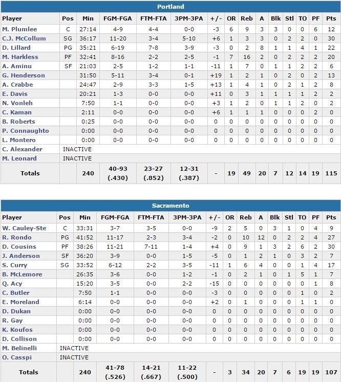 À noter : McCollum a inscrit 19 points en première mi-temps mais Portland était tout de même mené 57-51 à la pause (2/9 de Lillard). George Karl avait mis Darren Collison, Kosta Koufos et Rudy Gay au repos.