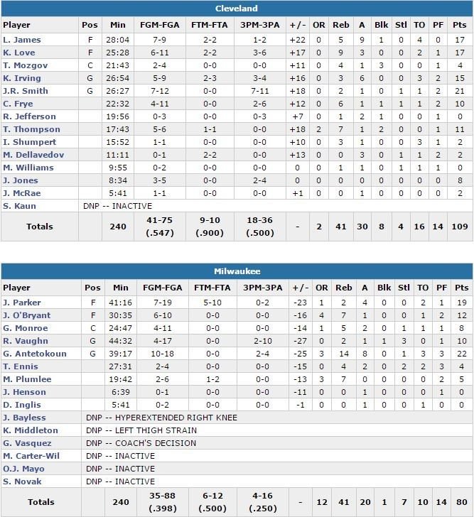 Six Cavaliers ont inscrit au moins 10 points cette nuit dans la victoire de Cleveland 109-80 sur le parquet des Bucks. J.R. Smith est en tête de cortège avec 21 points à 7/11 à 3-points, suivi par Kevin Love (17 points à 6/11, 9 rebonds et 3 passes), LeBron James (17 points à 7/9, 5 rebonds et 9 passes) et Kyrie Irving (15 points à 5/9, 3 rebonds et 6 passes) dans un match où les visiteurs ont shooté à 54.7% (18/38 à 3-points).