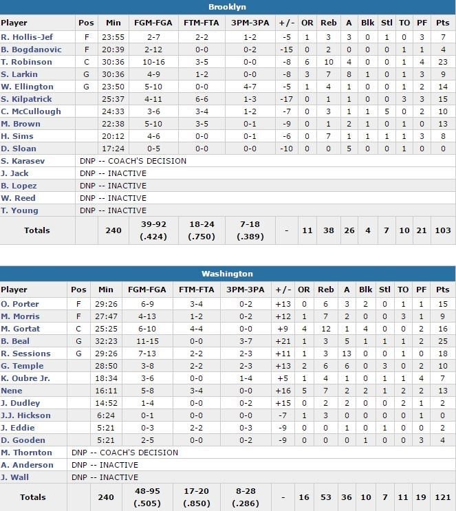 Pour sa première titularisation de l’année, Sessions distribue 10 de ses 13 passes en 1ère mi-temps et permet aux Wizards de mener de 2 points à la pause. Washington confirme par un 9-0 dans le 3ème quart-temps pour creuser l’écart. Otto Porter démarre le run par un 2+1, Gortat rentre 2 lancers-francs et un layup et Markieff Morris enchaîne avec un reverse pour donner 9 points d’avance aux locaux, 66-57. Plus tard, un turnaround ligne de fond de Porter porte le score à 79-66, puis 88-75 sur un layup de Sessions pour boucler le 3ème quart. Washington démarre le 4ème quart-temps par un 10-1 pour définitivement mettre le match hors de portée pour ses adversaires.