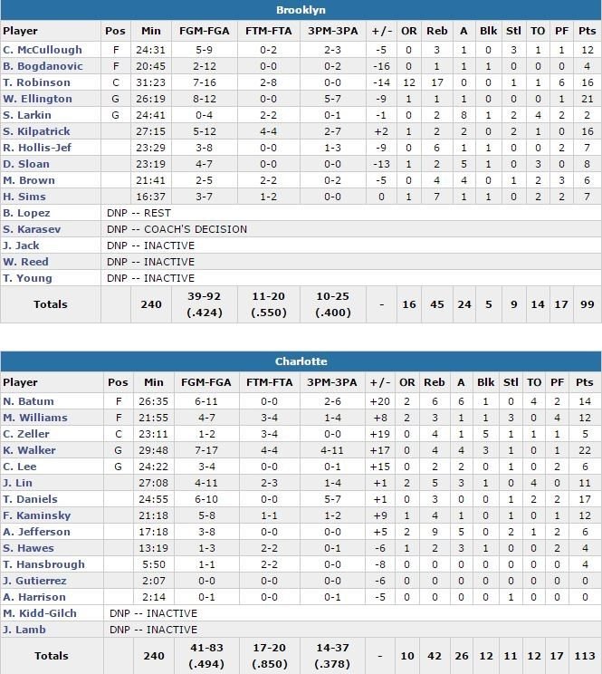 Sweep complété pour les Hornets face à Brooklyn cette saison avec une victoire 113-99 cette nuit, portée par 22 points (7/17, 4 rebonds, 4 passes et 3 contres, 41ème match à minimum 20 pts en saison) de Kemba Walker, 17 points (5/7 à 3-points) de Troy Daniels (qui a rentré ses 5 premiers 3-points de la soirée) et 14 points (6/11, 6 rebonds et 6 passes) de Nicolas Batum, de retour après 2 matchs manqués pour une entorse du genou.
