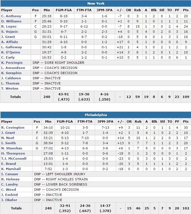 New York (dont 4 des 32 victoires l’ont été contre les 76ers, premier sweep de leurs voisins depuis la saison 1994-95) a retrouvé la victoire après 2 défaites consécutives cette nuit en s’imposant 109-102 à Philadelphie dans le sillage des 20 points (8/18) de Carmelo Anthony, 24 points (9/17) et 15 rebonds de Robin Lopez et 16 points (6/7, 5 rebonds et 4 passes) de Sasha Vujacic.
