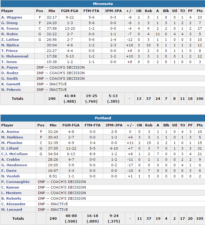 Le début de rencontre a été à l’avantage des locaux qui ont pris jusqu’à 10 points d’avance mais Minnesota est revenu avant la pause à la faveur d’un 19-8, et a même terminé en tête 53-49. En 3ème acte les Blazers ont eu un passage à vide offensif avec seulement 2 paniers lors des dernières 5’30 du quart mais sans trop de conséquences avec un score de 75-72 pour Minnesota à l’entame des 12 dernières minutes. Mccollum, Ed Davis et Allen Crabbe ont mis brièvement Portland en tête avant que Towns et Muhammad ne propulsent à nouveau les leurs aux commandes. Ces derniers ont même fait le mini-break le mini-break avec un 8-2 sous l’impulsion de Towns et Wiggins pour mener 100-93 à 3’03 du buzzer. Les visiteurs ont alors connu un gros passage un trou d’air en attaque avec aucun panier en plus de 2 minutes, ce qui a profité à Portland et à Damian Lillard. Ce dernier a réduit l’écart à 2 points à 61 secondes de la fin sur un floater. Wiggins a répondu par deux lancers à 41 secondes de la fin mais le layup de Lillard à 13.3 secondes de la fin a remis Portland à une unité. LaVine a redonné de l’air aux siens mais dans la foulée Lillard a réussi l’exploit avec un 3 points plus la faute offrant la tête 105-104 aux siens avec 3.5 secondes à jouer. Le rookie KAT s’est alors occupé de mettre le coup de grâce.