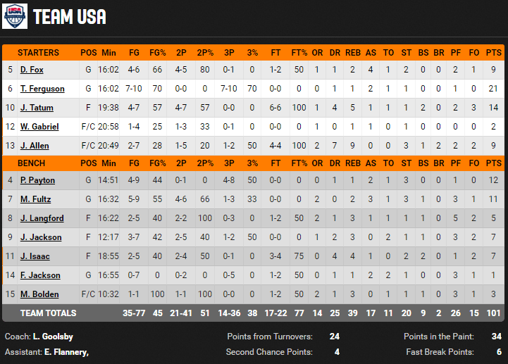 Le dunkeur Ferguson a inscrit 7 trois points (record du Hoop Summit) pour un total de 21 points avec un énorme coup de chaud en fin de première mi-temps. Il a inscrit 6 trois points en moins de 4 minutes pour un avantage 44-22 à la pause. Les Américains ont rentré 14 de leurs 36 tentatives derrière l’arc. Markelle Fultz a ajouté 11 points, 3 passes et 5 interceptions et Jayson Tatum 14 points.