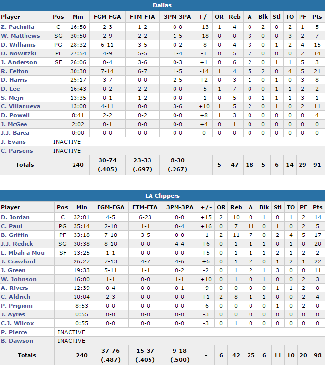 Ce match ne rentrera pas dans la légende avec notamment du Hack-A-Jordan, le pivot des Clippers ayant shooté à 4/19 aux lancers. Les Californiens ont été menés par leurs arrières JJ Redick (20 points à 8/10 dont 4/4 à trois points) et Jamal Crawford (22 points à 7/13 dont 4/6 à trois points) alors que Blake Griffin (17 points à 7/18, 11 rebonds et 7 passes) a été important en dernier quart après 3 premiers actes où il a été maladroit. Chris Paul passe à côté en attaque avec 5 points à 2/10 mais compense avec 7 rebonds et 11 passes. Les Clippers shootent à 48.7% dont un 9/18 derrière l’arc pour compenser leur 15/37 aux lancers. C’est l’adresse qui a coûté le match à Dallas, avec un énorme trou d’air au retour des vestiaires et termine à seulement 40.5% aux tirs, en plus de 14 ballons perdus. Raymond Felton signe 21 points, Deron Williams 15 pour son retour et Dirk Nowitzki 14.