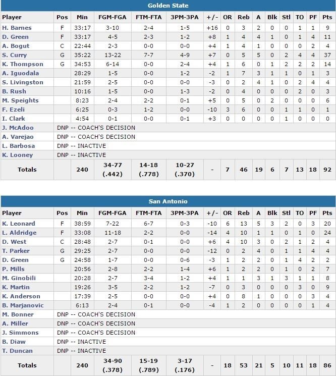 À noter : Golden State (44.2%, 10/27 à 3-points) a été limité à 14 points dans le 1er quart-temps (19-14 San Antonio). Les Warriors limiteront ensuite leurs adversaires à 19 points dans le 2ème et les deux équipes se retrouvent à égalité 35 partout à la pause. Tony Parker termine à 4 points à 2/7, 2 rebonds et 4 passes en 29 minutes.