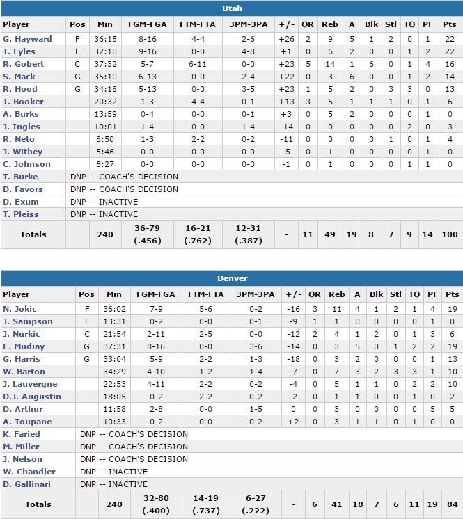 Trey Lyles (titulaire en l’absence de Derrick Favors, souffrant du genou droit), Gordon Hayward et Rudy Gobert ont mené l’équipe avec respectivement 22 points (record en carrière, 9/16 et 4/8 à 3-points, 6 rebonds et 2 passes, 22 points (dont 10 dans le 3ème quart-temps) à 8/16, 9 rebonds et 5 passes et 16 points à 5/7 et 6/11 aux lancers-francs, 14 rebonds et 6 contres. Les deux rookies Nikola Jokic (7/9, 11 rebonds et 4 passes) et Emmanuel Mudiay (8/16, 3 rebonds et 5 passes) terminent co-meilleurs marqueurs pour Denver avec 19 points chacun mais les Nuggets se font sweeper par Utah cette saison (0-4 avec une moyenne de seulement 84.3 points par match contre la défense d’Utah).