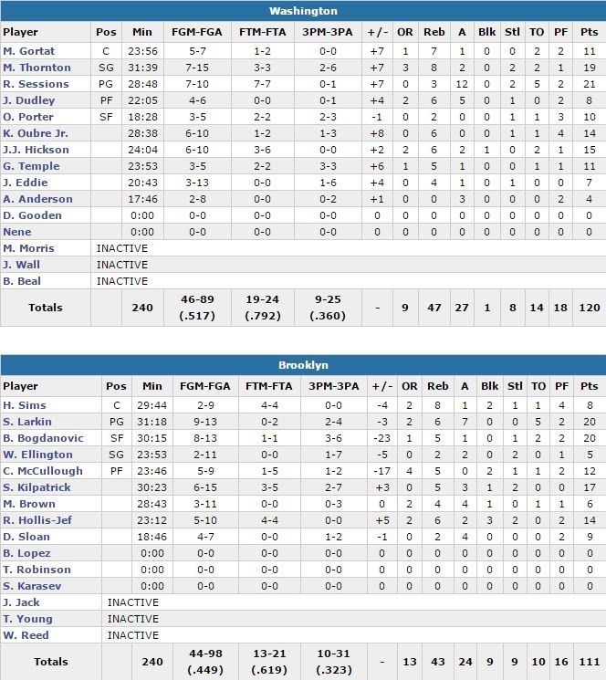 Sans John Wall (genou) et Bradley Beal (pelvis), blessés, les Wizards se sont imposés 120-111 malgré une avance de 20 points gâchée face aux Nets au Barclays Center. Ramon Sessions signe 21 points à 7/10 et 12 passes tandis que Marcus Thornton termine à 19 points à 7/15 et 8 rebonds et J.J. Hickson 15 points.