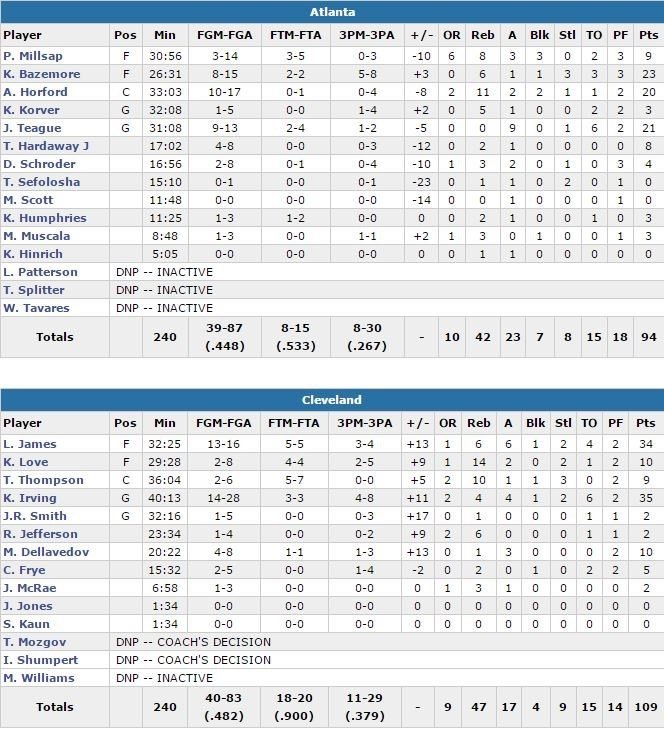 James a inscrit 19 points dans le seul 3ème quart-temps pour offrir à son équipe l’avantage du terrain jusqu’en Finales NBA. Et lorsqu’il s’est définitivement assis sur le banc en fin de période, Irving a pris le relais avec 9 points sur les 4 premières minutes sans James sur le parquet. Kevin Love a de son côté ajouté 10 points à 2/8 et 14 rebonds alors qu’en face, Kent Bazemore (23 points à 8/15 et 6 rebonds) et Jeff Teague (21 points à 9/13 et 9 passes) sont les meilleurs marqueurs d’Atlanta. Les Hawks perdent pour la 7ème fois d’affilée contre Cleveland.