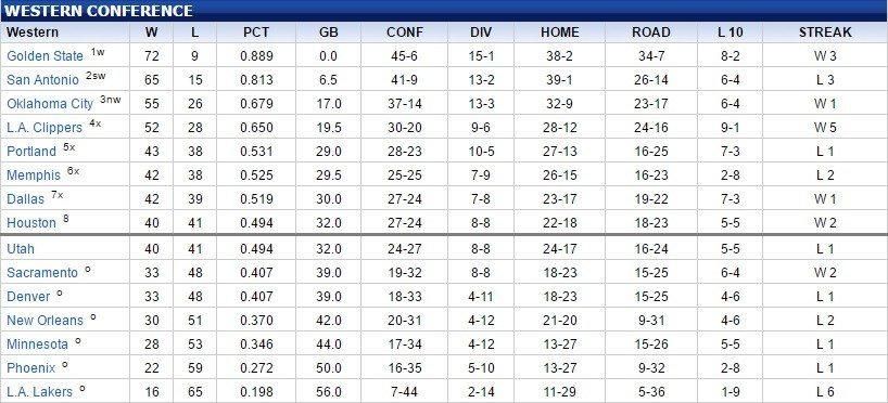 On connait déjà l’ordre des 4 premiers de la conférence et le dernier qualifié, Jazz ou Rockets, sera déterminé demain soir. Les Rockets ont repris la main en battant les Wolves et en profitant de la défaite du Jazz puisqu’à bilan égal, les Texans sont devant grâce à un meilleur bilan dans la conférence Ouest. Du coup en cas de victoire demain pour la réception des Kings ils seront qualifiés. Pour le Jazz, qui se déplace aux Lakers, la seule chance de se qualifier est de gagner et espérer une défaite de Houston.