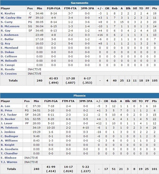 5 autres joueurs des Kings (49.4% de réussite contre 41.4 pour Phoenix) signent au moins 10 points, dont Kosta Koufos avec 19 points à 8/14 et 8 rebonds et Rudy Gay avec 15 points à 6/13, 6 rebonds et 4 contres. Côté Phoenix, Mirza Teletovic est meilleur marqueur (26 points à 10/20) devant Devin Booker, auteur de 22 points (8/20, 4 rebonds et 4 passes) dont 18 en seconde mi-temps pour aider les Suns à passer d’un déficit de 16 points à seulement 2 en fin de match.