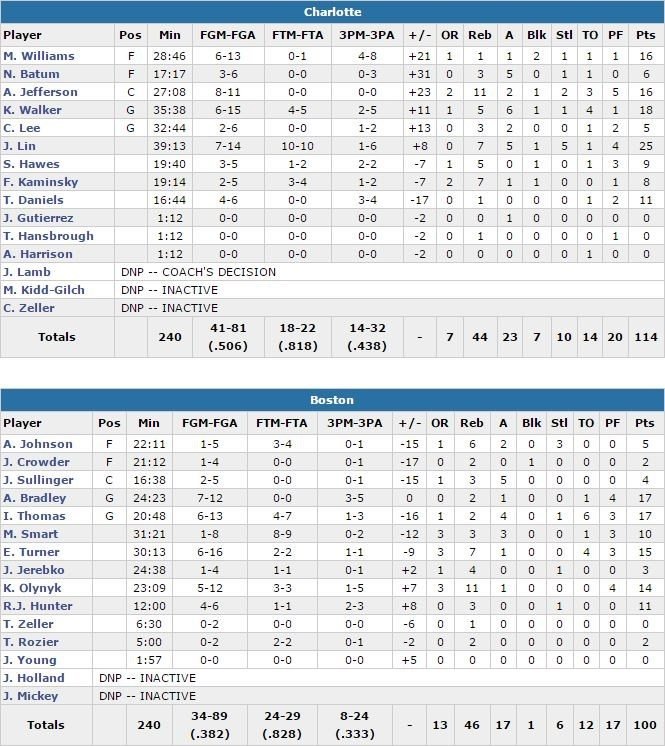Kemba Walker suit avec 18 points (6/15, 5 rebonds et 6 passes)et Al Jefferson (8/11, 11 rebonds) et Marvin Williams (6/13, 2 contres) ajoutent chacun 16 points. En face Isaiah Thomas (6/13, 4 passes) et Avery Bradley (7/12) sont co-meilleurs marqueurs avec 17 points chacun.