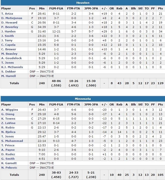 Les Wolves jouaient pour une première 4ème victoire d’affilée depuis 2012 mais s’inclinent malgré 23 points de Shabazz Muhammad et 21 points de Zach LaVine. Karl-Anthony Towns a par contre été tenu à 12 points à 6/15 et 5 rebonds alors que Minnesota n’a shooté qu’à 5/21 à 3-points. Le sentiment d’urgence s’est fait ressentir côté texan avec un duo Howard – Harden qui donne le ton dès l’entame (38 points de Houston dans premier quart). Howard a pris le meilleur sur Towns (1/7 pour commencer le match), limitant son accès au cercle tout en enchaînant les dunks et les petites claquettes de l’autre côté.