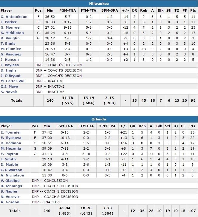 Malgré l’absence de 3 titulaires blessés (Victor Oladipo – commotion -, Nikola Vucevic – aine et jambe droite – et Aaron Gordon – commotion -), Orlando a été assez dominant sur certaines séquences pour faire face aux 5 joueurs des Bucks à au moins 10 points, dont Greg Monroe (23 dont 15 dans le premier quart-temps), Jabari Parker et Khris Middleton (17). Le Magic est devant 58-44 à la pause et contrent 8 shoots rien qu’en première mi-temps. Dewayne Dedmon montre l’exemple avec 14 points, 6 rebonds et 3 contres.