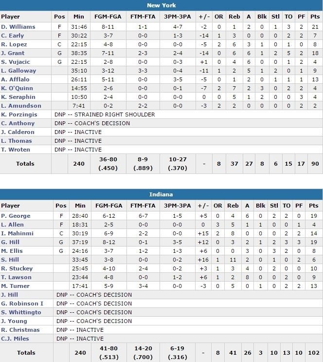 Paul George (19 points à 6/12, 4 rebonds et 6 passes) et George Hill (19 points à 8/12, 3 rebonds et 2 passes) ont permis aux Pacers de terminer sur une bonne note à domicile cette nuit en dominant New York, 102-90. La saison des Knicks prend donc fin sur une 50ème et dernière défaite.