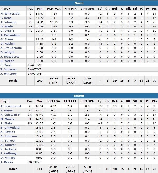 Goran Dragic suit avec 16 points, Hassan Whiteside 14 points, 9 rebonds et 3 contres et Luol Deng 17 points et 10 rebonds. Dwyane Wade (14 points à 6/16) a lui connu son début de match le plus lent en 10 ans offensivement. Il va ainsi devoir attendre qu’il reste 4’14 à jouer en 1ère mi-temps pour inscrire son premier panier de la partie. Il n’avait jamais été tenu à 0 point aussi longtemps depuis le 17 mars 2006 contre Charlotte. Il marquera ensuite 7 points en 50 secondes.