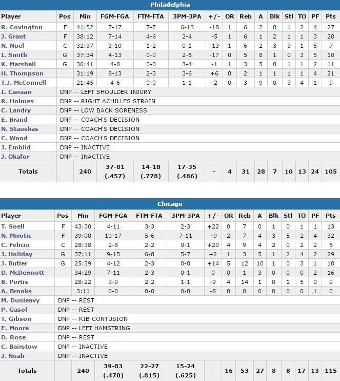 Derrick Rose et Pau Gasol au repos, Chicago est rapidement mené 42-18 sur un 3-points de Covington en début de 2ème quart. Les Bulls réagissent finalement alors qu’ils sont menés de 21 points par un 25-1 dans le 3ème quart. Les locaux scorent les 12 derniers points de la mi-temps, dont 2 points sur un dunk de Butler qui réduit l’écart à 2 points, 60-58. Nerlens Noel rentre un lancer-franc puis Holiday et Tony Snell balancent des missiles à 3-points pour offrir 3 points d’avance aux Bulls à moins de 9 minutes de la fin du 3ème (35-13 dans la période). Les 12 dernières minutes tournent à l’avantage des 76ers, qui avaient néanmoins pris un trop gros coup sur la tête dans le 3ème.