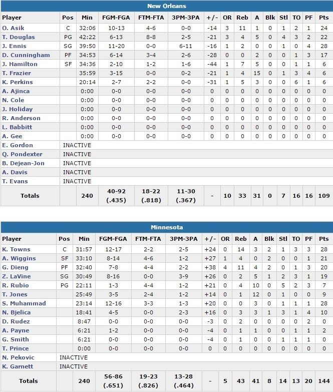 Minnesota shoote à 65% (13/28 à 3-points) face à une équipe de New Orleans qui n’a aligné que 7 joueurs pour ce dernier match de la saison. Malgré les 24 points et 11 rebonds d’Omer Asik, les 28 points de James Ennis et les 22 points de Toney Douglas, les Pelicans sombrent rapidement en encaissant pas moins de 40 points dès le 1er quart. Andrew Wiggins et Zach LaVine participent aussi à la fête avec respectivement 21 points à 8/14 et 19 points à 8/16, tandis que Ricky Rubio et Tyus Jones régalent avec 10 passes décisives chacun. Pour l’anecdote, Kendrick Perkins a rentré un 3-points au buzzer du 3ème quart-temps…