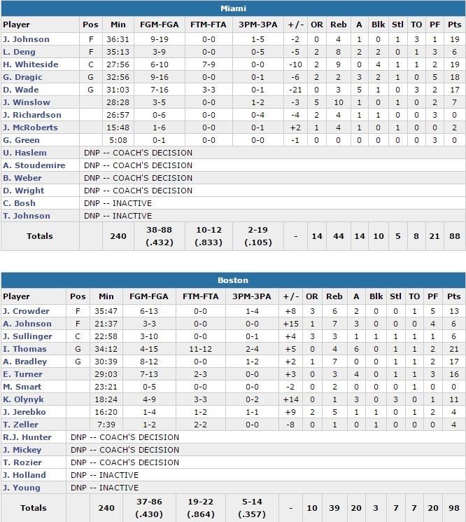 Avery Bradley et Evan Turner ont respectivement ajouté 17 points (8/12) et 7 rebonds et 16 points (7/13, 3 rebonds et 4 passes) pour épauler Thomas et faire face aux 19 points chacun du duo Joe Johnson (9/19) – Hassan Whitside (6/10, 9 rebonds et 4 contres), aux 18 points de Goran Dragic et 17 de Dwyane Wade. La 1ère mi-temps est tout à l’avantage du Heat, qui mène 62-38 à la pause ! Mais tout bascule dans le 3ème, où Miami est limité à seulement 5 points (tous de Johnson). Boston se rapproche à 4 points avant de jouer le 4ème quart, 67-63. La période se termine également sur une embrouille entre Marcus Smart et Dragic.