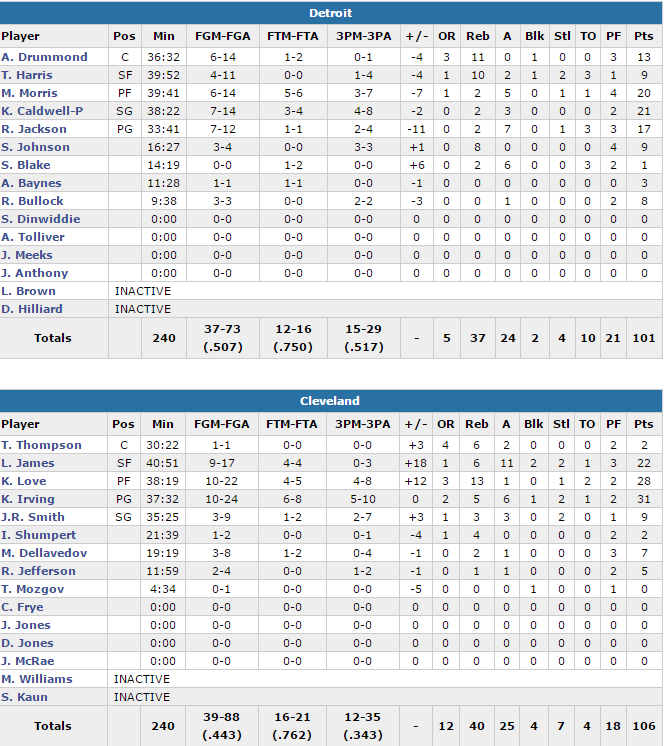 Les Cavaliers se sont appuyés sur un super Big Three Kevin Love (28 points à 10/22 dont 4/8 à trois points et 13 rebonds), Kyrie Irving (31 points à 10/24 dont 5/10 à trois points et 6 passes) et LeBron James (22 points à 9/17, 6 rebonds et 11 passes). Ils ont combiné 81 des 106 points des leurs. Ils ont été moins bien adroits que Detroit avec 44.3% contre 50.7 mais ont perdu seulement 4 ballons et pris 12 rebonds offensifs.