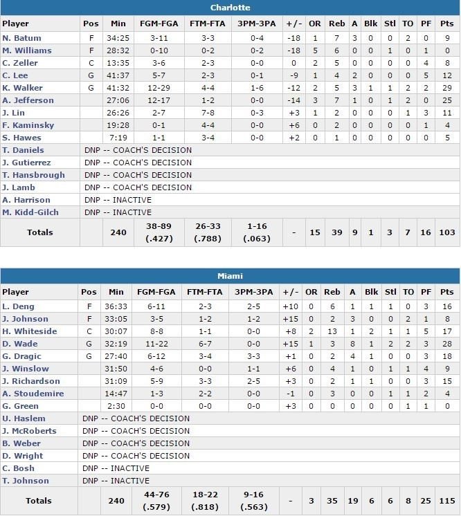 Miami tourne désormais à 119 points de moyenne sur les 2 premiers matchs. Goran Dragic ajoute 18 points (6/12, 4 passes), Luol Deng 16 (6/11, 6 rebonds) et le rookie (1,98m, 22 ans, 40ème choix après 4 ans à Tennessee) Josh Richardson 15 (5/9) pour des Floridiens qui comptaient déjà 72 points à la mi-temps (74.4% de réussite) et qui ont fait la course en tête durant l’intégralité de la seconde mi-temps. En face Kemba Walker termine à 29 points (12/29, 5 rebonds et 3 passes) mais a au besoin de 29 shoots pour y arriver, Al Jefferson signe 25 points à 12/17 et 7 rebonds en sortie de banc.